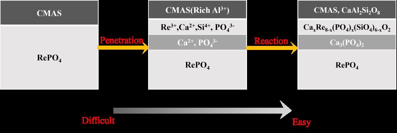 该论文是国家自然科学基金、湖南省教育厅基金等资助的重要成果之一,由孙俊彬副教授和许志锋教授共同指导完成。l9193永利为第一署名单位,李利珍为论文第一作者。论文研究结果表明:多组分稀土磷酸盐材料在12501350下经CMAS腐蚀5 h10 h20 h后的主要腐蚀产物为磷灰石(Ca2+xRe8-x(PO4)x(SiO4)6-xO2)和Ca3(PO4)2Ca3(PO4)2组成的P-Ca层可阻止熔融CMAS的进一步渗透。与其他稀土离子相比,La3+更难与CMAS形成磷灰石。因此,降低La元素含量和稀土离子半径差有望成为提高多组分稀土磷酸盐材料抗CMAS性能的新途径。