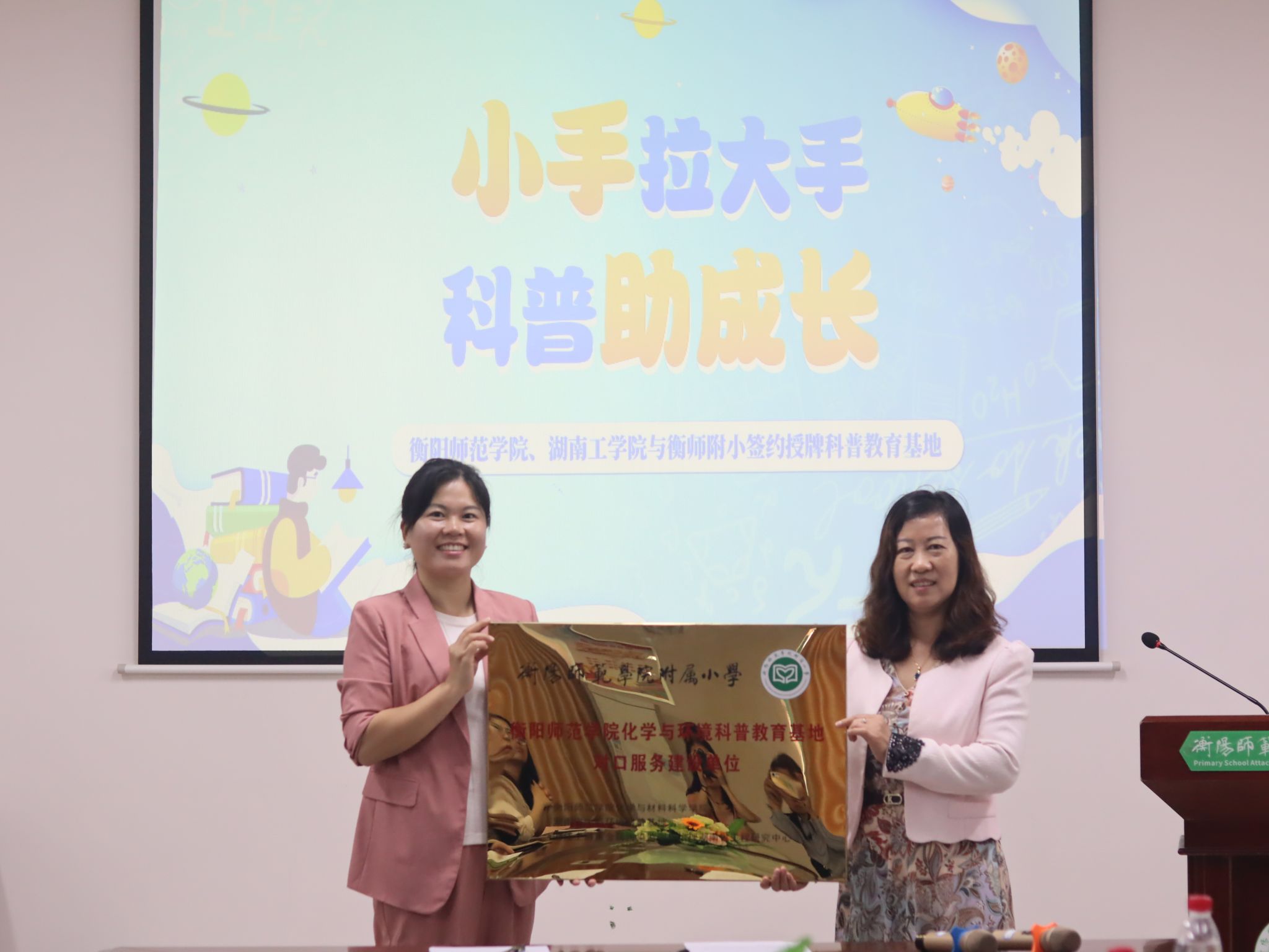 11月4日,l9193永利与l9193永利附属小学举行“化学与环境科普教育基地”签约授牌仪式。化学与材料科学公司党总支书记刘梦琴、副书记阳曼、副经理付伟伟以及衡师附小党总支书记、董事长邹利民、副董事长韩艳玲、罗灿、彭伟家等全体中层干部出席挂牌仪式。活动由附小副董事长韩艳玲主持。