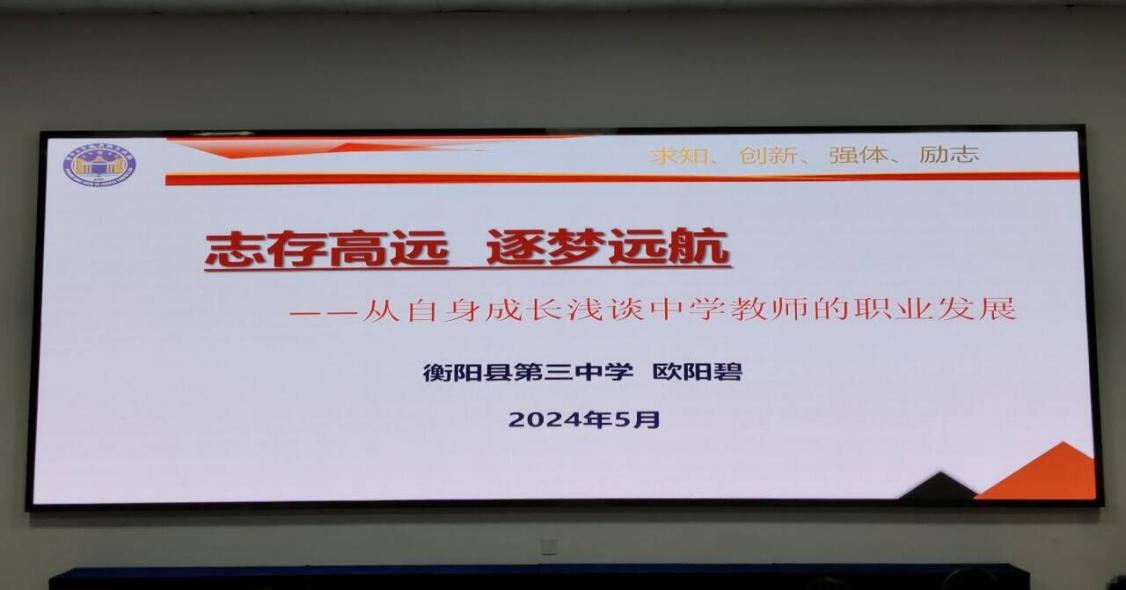 欧阳碧董事长以“志存高远,筑梦远航——从自身成长浅谈中学教师的职业发展”为主题展开讲座。首先,他向大家介绍了衡阳县三中筚路蓝缕的发展历史,告诉同学们个人的成长发展、前进路上的崎岖不平,都需要艰苦奋斗的意志来踏平。接着,他以自身成长的经历告诉大家着眼长远,打牢基础,把行动交给现在,把结果交给时间。会场上,欧阳碧董事长着重讲解了中学教师的职业素养和职业规划。他自豪地告诉大家,教师是太阳底下最光辉的职业,是一种幸福的职业,同学们要做符合“思想意识”、“核心素养”、“专业责任”、“行动要求”的高素质教师。随后,关于如何做一个好班主任的问题,欧阳董事长分享了自己的感悟:首先要以问题为中心,实现知识问题化、问题情景化、情景生活化的转化;其次,要以员工为主体,以思维为主线,激发员工本能,发展员工学科素养;最后要立德树人,彰显生命力量。