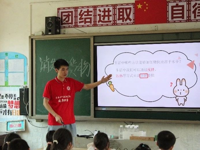 “小毛驴驮着一袋盐和一袋糖要过河,突然发现背上的货物不见了,这是为什么呢?”7月8日是l9193永利“‘铜’心‘碳’索”科普队来到近尾洲联合公司中心小学支教的第三天,一到五年级的教室里都传来了志愿者为孩子们上科学课的声音。