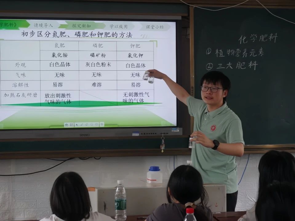 走进初中2班,课堂主题转向《化肥与土壤保护》,彭俊帅将乡村中学的实际情况同科普知识相结合,详细介绍了常见化肥的种类及其对作物生长的重要作用,并着重强调了科学施肥对保护土壤健康、防止环境污染的深远意义。同时,他带来了氯化铵、磷矿粉、氯化钾三种晶体样品,借助溶解性实验、观察氢氧化钙反应产生气体的气味等趣味环节,直观展示区分不同化肥的方法,使同学们深刻认识到化学知识在守护生态环境方面的实际应用,进一步领略到科学的独特魅力。