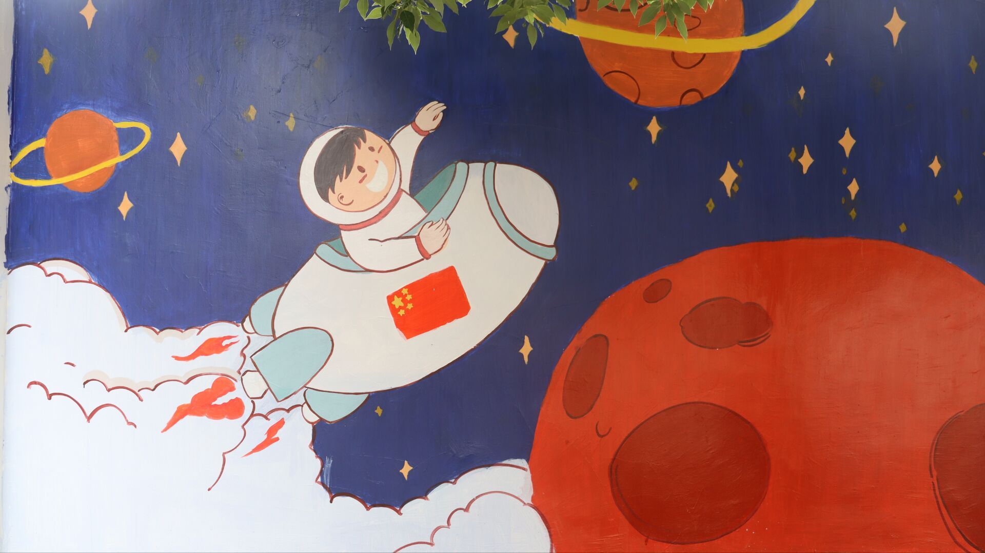 近日,衡南县近尾洲联合公司中心小学的校园围墙有了新的变化,七面30余平米的空白墙面绘制了“太空”“宇航员”“火箭”“星星”等图案,并搭配了深蓝、浅紫、橘黄等大面积的色彩,在周围环境的映衬下显得格外亮眼。