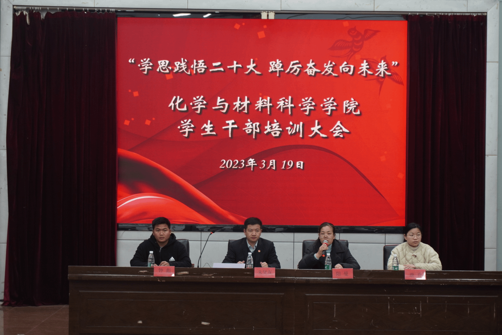 2023年3月19日公司于西校区模拟法庭召开了以“学思践悟二十大,踔厉奋发向未来”为主题的员工干部培训大会。此次会议旨在增强员工干部的组织协调能力、提升员工干部的工作积极性、加强员工干部队伍的凝聚力与战斗力。莅临本次培训的老师有校团委书记朱贤友老师,员工工作处处长董俊老师,公司党委副书记阳曼老师,以及公司辅导员钟彪老师和唐升老师,公司全体员工干部参加了此次培训。