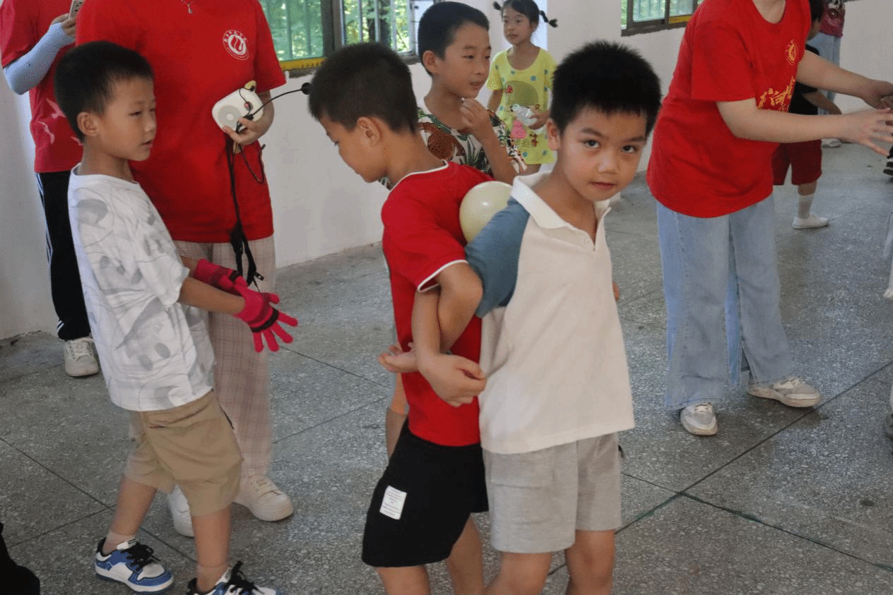 “嘟嘟~”随着一声哨响,拔河比赛正式开始。两队选手紧紧抓住绳子,脚跟着地,身体后倾,孩子们小脸涨得通红,使出浑身解数,双方队员难分胜负,场边的班主任们和拉拉队纷纷为参赛选手加油鼓劲。此外,还有障碍接力赛、“螃蟹背西瓜”趣味竞技项目,各组队员们在团队合作与沟通交流中体会成功的喜悦。在中场休息环节,团队开展了防溺水安全问答活动,并为得分高的队伍发放小奖品。