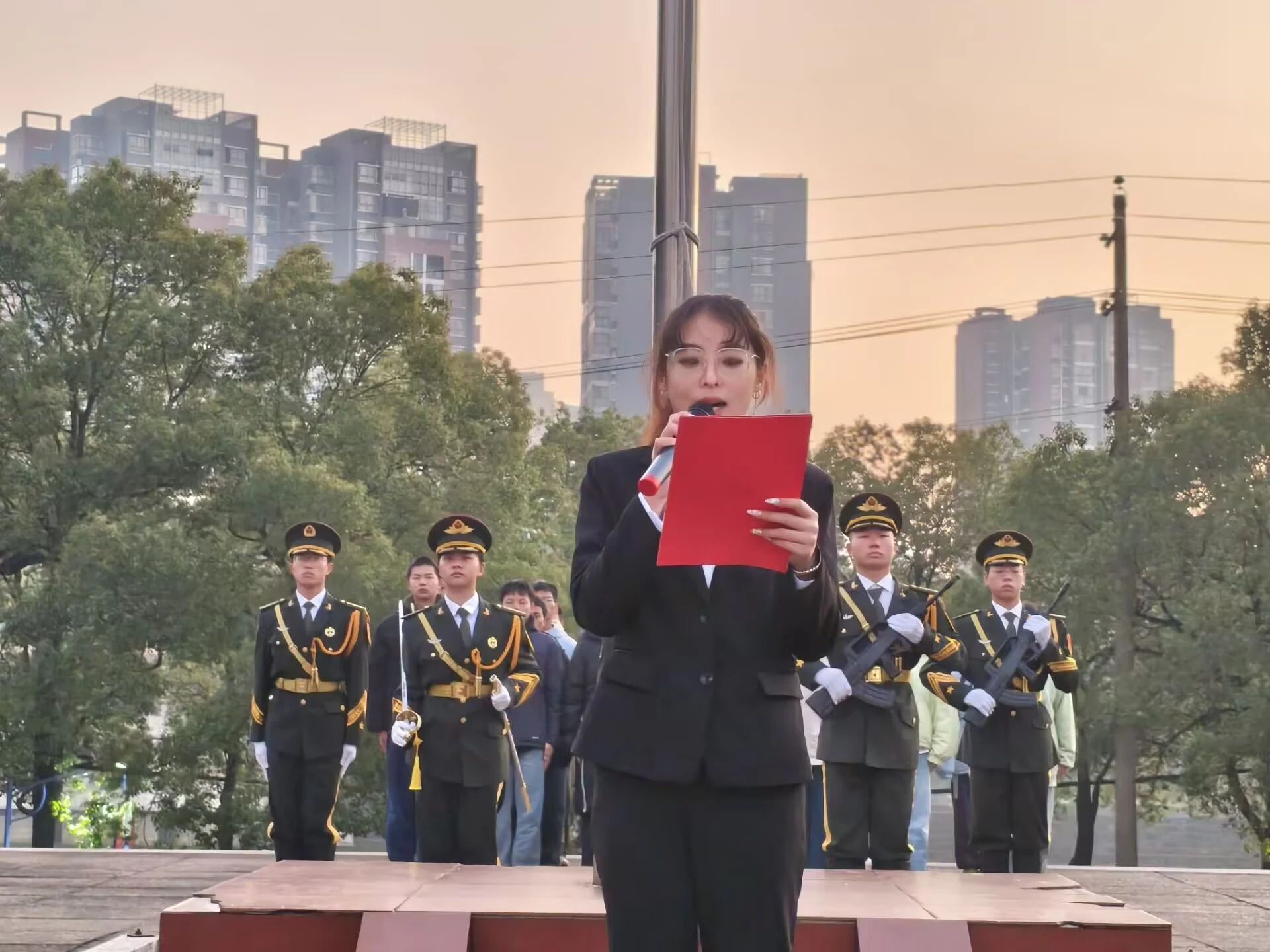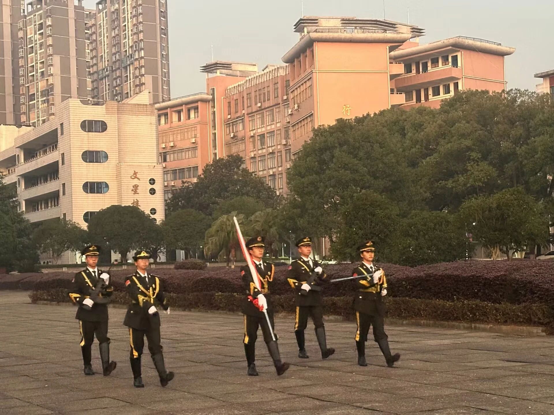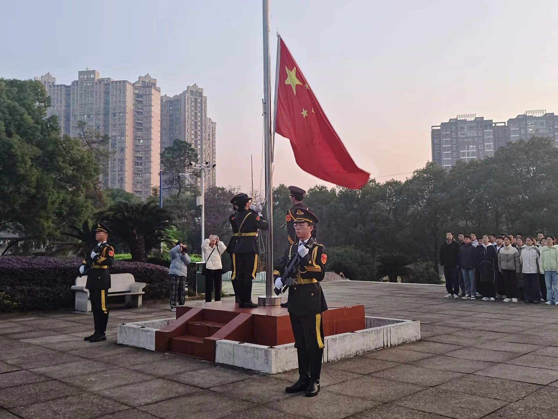 黎明初照,队伍已在新世纪广场整齐列队。教导队成员们护卫着五星红旗,昂首阔步,踏着坚定而有力的步伐走向升旗台。伴随着激昂的《义勇军进行曲》,全体成员肃立、行注目礼,鲜艳的五星红旗冉冉升起,随风飘扬,每个人的心中涌动着对祖国深深的爱与敬意。